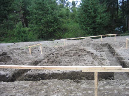 Villagers staked out the buildings with timber and rope on the hand-leveled building site.